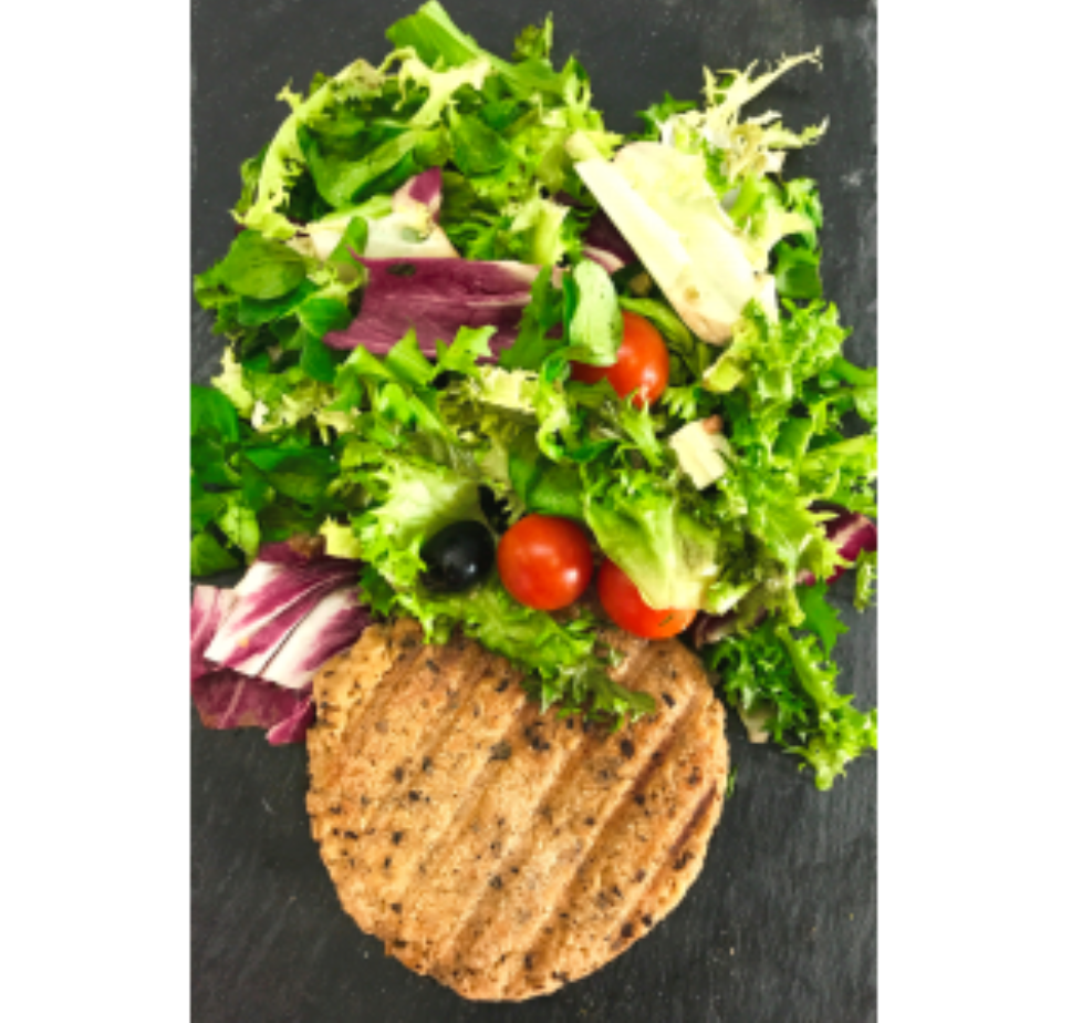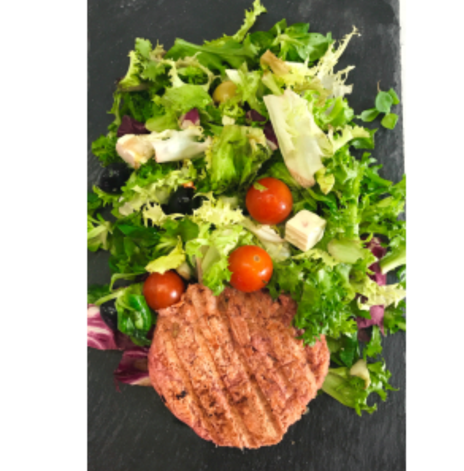 Hamburguesa (53,4%) (chia, nuez, proteína de SOJA texturizada, almidón, fibras vegetales, especias, sal), verduras braseadas (46,6%) (cebolla, zanahoria, pimiento verde, pimiento rojo, tomate,calabacín alcachofas)